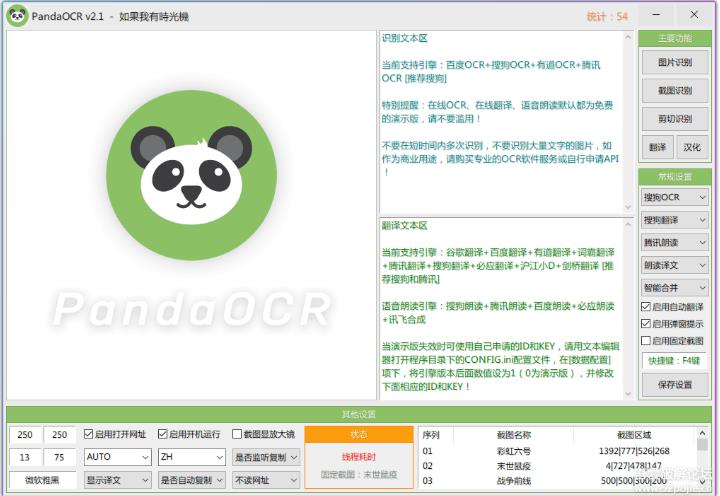 PandaOCR中文版是一款集OCR文字識別,翻譯工具,朗讀、圖片識別文字、翻譯、漢化、、截圖、朗讀等功能為一體的實用工具,翻譯采用百度、谷歌、有道等API翻譯引擎,和天若OCR類似,也是非常好用的,有需要的朋友可以試試看。
