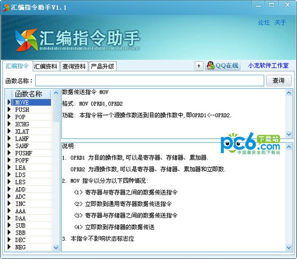 匯編指令助手是一個進行匯編程序設計參考和學習的工具,主要功能包括可查詢匯編指令、添加常用工具、QQ窗體的縮入伸出等,可以進行匯編函數查詢,查詢結果包括名稱、格式、功能,說明。還包括匯編資料,包括狀態(tài)寄存器,直接標志轉移,匯編簡介,包括匯編指令test、mov、cmp、lea等,以及支持查一個字符的各種進制。