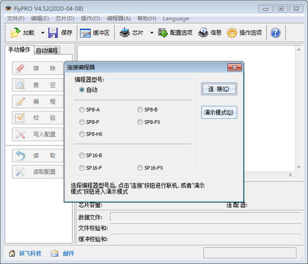 FlyPRO燒錄器是一款由碩飛科技推出的SP8系列和SP16編程器產(chǎn)品驅(qū)動(dòng)工具,F(xiàn)lyPRO提供芯片所需的各種燒寫操作.。主要支持"擦除","讀取","校驗(yàn)","編程","寫入/讀取配置"等等功能,大家可以借助該工具完成對芯片的在座編程,以及對用戶目標(biāo)板的ISP下載的操作!