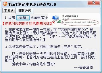 1、將從本站下載的壓縮包文件解壓,在解壓出來的文件夾中找到“青青草原WiFi20.exe”文件,雙擊該文件就可以直接運行使用了。 2、啟動軟件后,先點擊【用前必讀】---【設置】開通你的無線網絡共享,再回到主界面設置選項、開啟即可。
