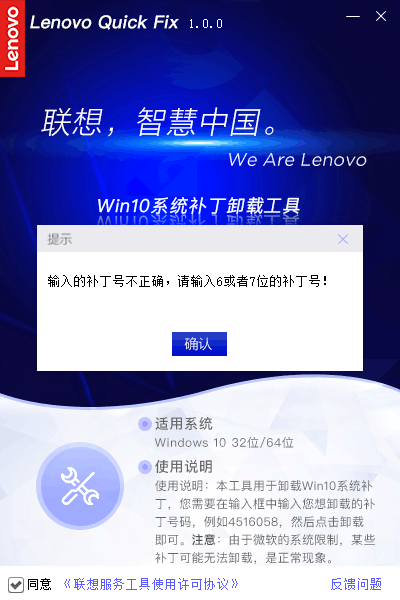若輸入的補(bǔ)丁號(hào)不正確,工具則彈出提醒信息,(輸入6位或者7位數(shù)字的補(bǔ)丁號(hào),無需輸入KB),如KKX給大家分享的圖片: