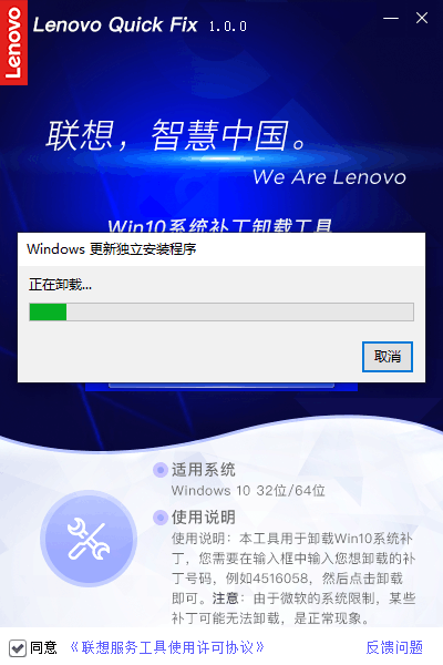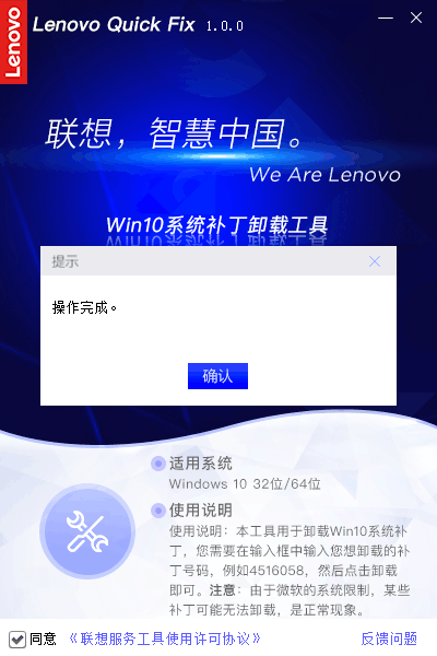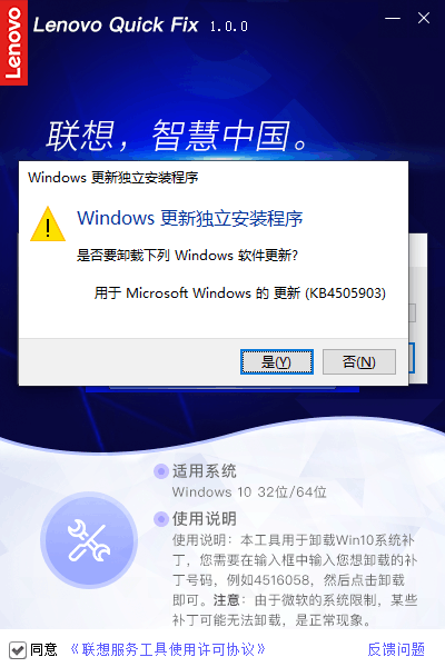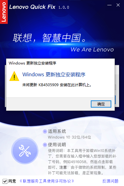 點(diǎn)擊“確認(rèn)”后調(diào)用Windows命令執(zhí)行搜索和卸載,若查詢到該補(bǔ)丁則可以繼續(xù)卸載,若系統(tǒng)內(nèi)不存在該補(bǔ)丁,將會(huì)彈出相關(guān)提醒信息