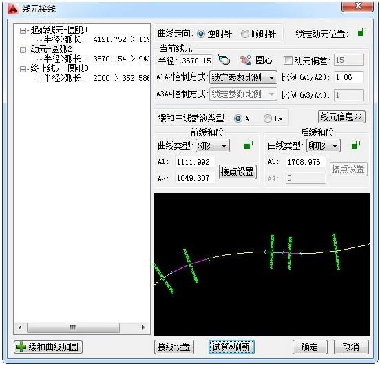 提供多種平面線形設計方法,包括導線法、曲線法、接線法、積木法設計,支持基本型、同向復曲線、S線、C線、回頭曲線等各種復雜曲線線形,提供動態(tài)拖動、參數輸入、切線控制、外距控制等靈活多樣的設計方法。
