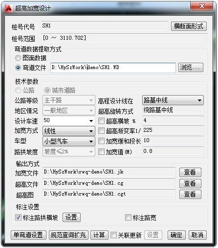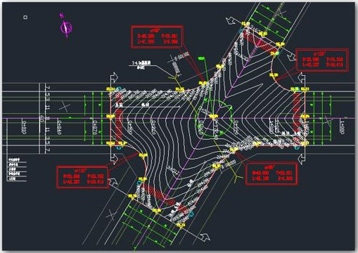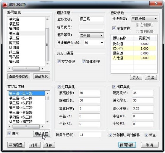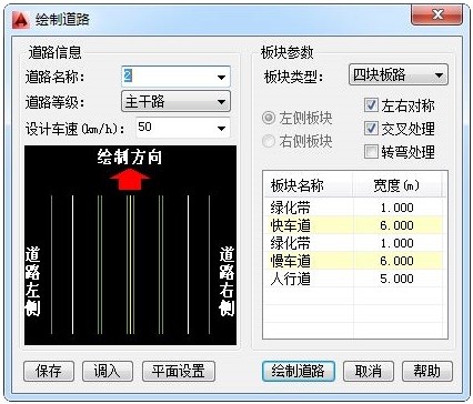 支持各種標準及自定義板塊形式道路的平面自動生成;交叉口和彎道自動處理;超高加寬自動計算和繪制等。