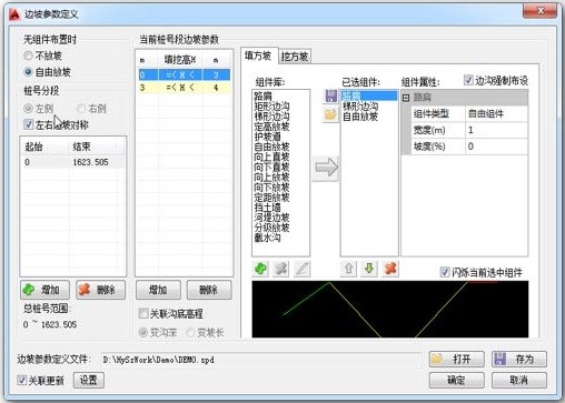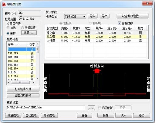 自動從數據地圖上獲取各樁號點橫剖面當然標高;鑒別多種格式的橫剖面當然標高件;可自動獲取平面圖中各特點樁橫斷面參數,全面適用變大變版塊路面;自動計算極高擴寬斷面轉變,模糊智能自動護坡設計方法,多級坡度、擋墻、邊溝等各種部件數據可靈便定適用挖階梯和定排水溝標高的設計方法,給予帶帽前的逐樁斷面瀏覽和迅速改動,修改后的斷面可智能反饋到統(tǒng)計表格中??梢罁M斷面帶帽結論自動制作征地線及示坡線。