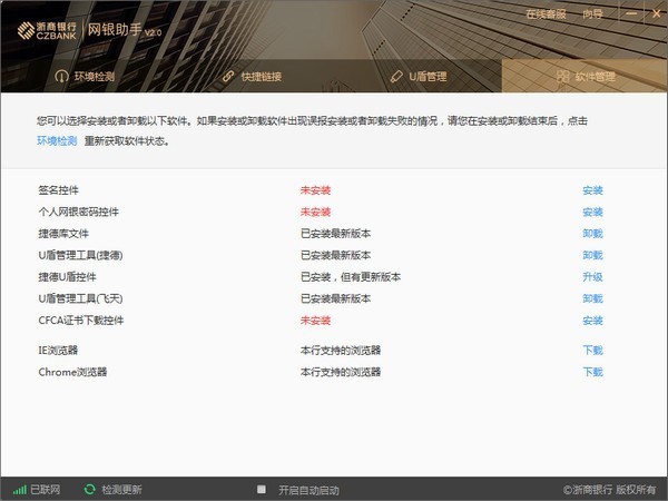 浙商銀行網(wǎng)銀助手由浙商銀行為廣大用戶提供,方便您在使用個人網(wǎng)上銀行之前進(jìn)行環(huán)境檢測等輔助操作,通過這款網(wǎng)銀助手可以幫助大家輕松的完成網(wǎng)上銀行首次登錄和日常使用。