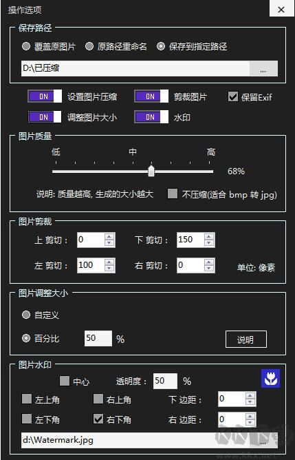 作者2012年開發(fā)1.1版本(僅400k)時,僅有圖片無損壓縮功能;后來經(jīng)過不斷更新之后,目前最新版本是v4.0.21.902,在壓縮圖片的基礎(chǔ)上,增加了(批量)剪裁圖片、調(diào)整圖片大小、添加水印等可選功能。
