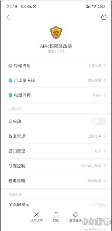 在主屏幕點(diǎn)擊 開(kāi)啟APK文檔 , 隨后挑選需改動(dòng)權(quán)限的apk程序, 稍后將表明apk程序的全部權(quán)限. 啟用要?jiǎng)h除的權(quán)限隨后點(diǎn)一下 清除 安裝 按鍵.