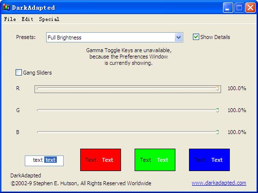 DarkAdapted是一個可以幫助你改變屏幕的Gamma值使得屏幕變的更亮的軟件。如果你的顯示器沒有高亮模式調(diào)節(jié)按鈕或者老式顯示器亮度調(diào)節(jié)按鈕失靈的話,可以使用KKX分享的DarkAdapted來進行調(diào)節(jié)!