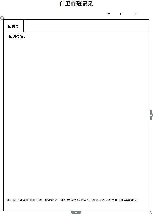 疫情門衛(wèi)值班記錄表格是一款適用于每位門衛(wèi)人員必須要使用的一個表格,在這里可以填寫每天值班人員名字,可以記錄值班當(dāng)天班進(jìn)出車輛、所載物品、往外拉運(yùn)材料批準(zhǔn)人、外來人員有一集值班情況,值班小結(jié)等內(nèi)容,如果你這能在尋找這個值班門衛(wèi)表格的朋友快來通過kkx分享的地址獲取吧!