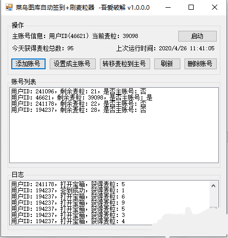 截圖如下:(這個(gè)是演示用4個(gè)小號(hào),1天可以刷95個(gè)麥粒,當(dāng)然你也可以注冊(cè)更多小號(hào))