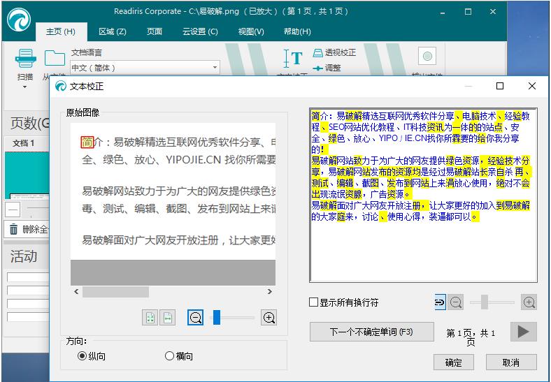 2、Readiris Corporate還可以把紙張、PDF文件、圖片文件掃描成可以編輯的文字,然后用你喜歡的編輯器進(jìn)行編輯。Readiris加入亞洲語(yǔ)言包就可以識(shí)別中文文字的圖片,紙張,PDF等文檔啦,非常方便文字辦公人員以及設(shè)計(jì)師的文字輸入編輯了!