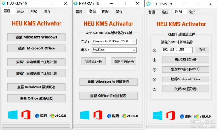HEU KMS 19是知彼而知己最更更新的Win10和Office激活工具,它支持Win10最新版本,和office 2010/2013/2016/2019,激活通吃所有的Windows和office,工具小巧只有2M,無廣告,無流氓行為,無捆綁,無后門的激活工具。是大家激活系統(tǒng)的絕佳工具。
