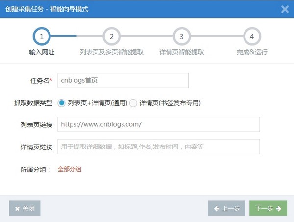 點(diǎn)擊左側(cè)菜單按鈕“創(chuàng)建采集任務(wù)”,輸入采集任務(wù)名和要采集的”列表頁“網(wǎng)址,如:https://www.cnblogs.com/ (這里首頁即作為列表頁:內(nèi)容含有多個(gè)詳情頁即可),詳情頁鏈接可不填,系統(tǒng)會自動識別。