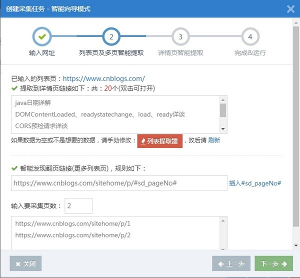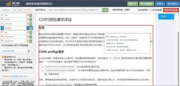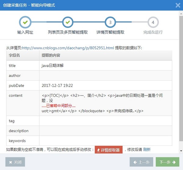 上一步獲取了多個(gè)詳情頁鏈接后,繼續(xù)下一步,系統(tǒng)會使用其中一個(gè)詳情頁鏈接來智能抽取詳情頁數(shù)據(jù)(如:標(biāo)題,作者,發(fā)布日期,內(nèi)容,標(biāo)簽等)