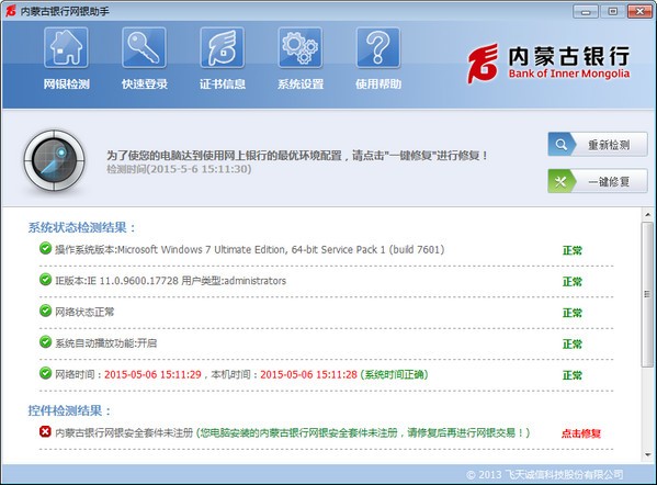 kkx小編本文中給大家分享的內(nèi)蒙古銀行網(wǎng)銀助手,是一款適用于內(nèi)蒙古銀行為保障網(wǎng)銀用戶安全推出的一款網(wǎng)上銀行交易工具,擁有網(wǎng)銀檢測、快速登錄、證書信息、系統(tǒng)設(shè)置和使用幫助五大欄目。內(nèi)蒙古銀行網(wǎng)銀助手支持快速登錄、證書下載以及自動(dòng)檢測電腦系統(tǒng)中的危險(xiǎn)信息并進(jìn)行修復(fù)等,可以有效保障用戶的交易信息和財(cái)產(chǎn)安全。