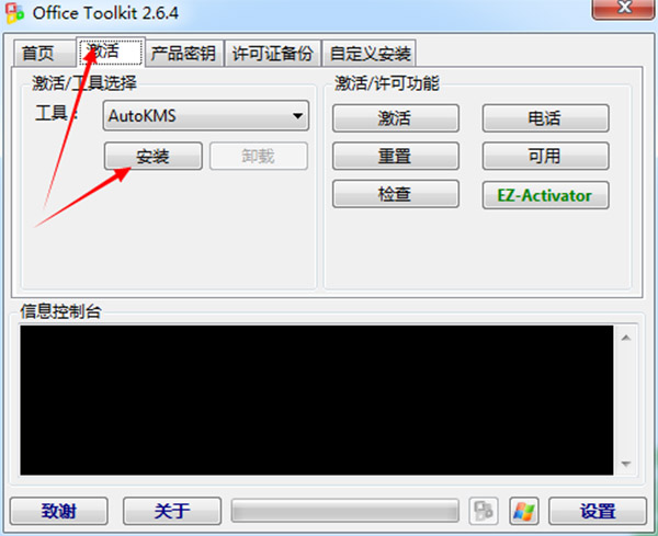 2、切換到激活頁(yè)面,選擇AutoKMS點(diǎn)擊安裝,安裝AtuoKMS之后激活到期會(huì)自動(dòng)續(xù)期。