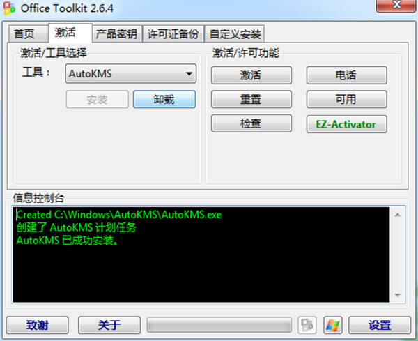 office2010Toolkit是一款Office2010激活工具,當(dāng)然除了常用的激活office2010之外,他還支持激活Win8/Win10系統(tǒng),office2013/office2016和最新的office2019,總的來說Toolkit同時(shí)具有Windows和Office激活功能,是KMS激活工具中比較好用的一款激活產(chǎn)品,可以自動(dòng)續(xù)期。這款工具是來至國(guó)外的嚴(yán)格檢測(cè)無毒。