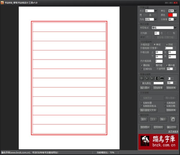 書法E站_硬筆書法紙?jiān)O(shè)計(jì)工具是一款支持保存多種圖片格式的書法設(shè)計(jì)工具,生成后直接將其打印出來就是一個(gè)完美的書法紙了。支持BMP、JPG、GIF、PNG、TIFF等預(yù)設(shè)橫格、豎格、方格、扇面等硬筆書法常用基本格式,有了這款工具你可以自由的生成書法紙。