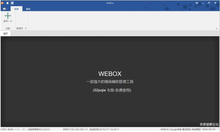 吾愛破解論壇網友發(fā)布的一款微信電腦版多開器(作者取名WEBOX),可以支持50個微信多開,具有群發(fā)清粉和靜默清粉功能,一鍵群發(fā)5000個群,自動接收轉賬及回復,批量管理好友、群、公眾號、自動同意群邀請、群主關鍵字踢人等等功能,是微商輔助工具絕佳軟件之一。有需要的朋友可以下載。