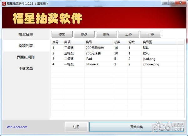 在獎項列表中維護所有獎項信息。抽獎順序為從上到下,即序號為1的獎項最先抽取,可以通過上移或下移按鈕來調(diào)整獎項的順序。