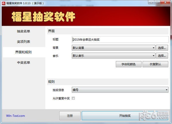 系統(tǒng)提供了默認的抽獎背景圖片和背景音樂。您也可以在界面和規(guī)則窗口中自定義背景圖片和音樂。系統(tǒng)提供可視化設(shè)計工具,可以定制抽獎界面的字體和顏色,所見即所得。