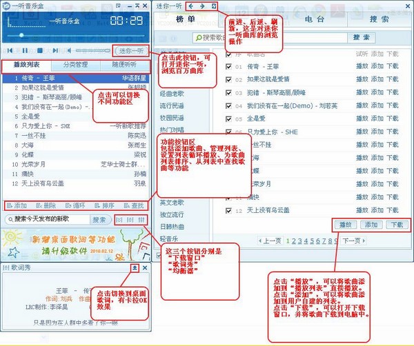 強(qiáng)勁而詳細(xì)的英語單詞同歩工作中;在播放視頻音樂的前提下,它能夠自動(dòng)連接到一聽音樂網(wǎng)的大中型音樂庫電腦瀏覽器,獲取類似歌詞,并和卡拉OK影響力同歩表明。