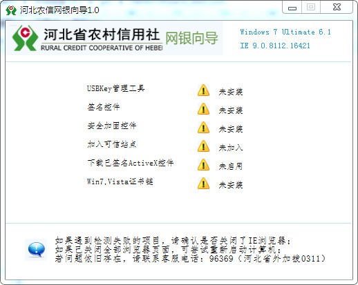 河北省農(nóng)村信用社網(wǎng)銀向?qū)Ь褪?ldquo;河北農(nóng)信網(wǎng)銀向?qū)?rdquo;,這是一款適用需要登錄河北農(nóng)村信用社的朋友們使用的一款網(wǎng)上銀行向?qū)к浖?,安裝該軟件后可以幫助你進(jìn)行管理usbkey,安裝簽名控件,安裝安全加固控件,加入可信站點(diǎn),下載已簽名的Activex控件以及證書(shū)!能指導(dǎo)您配置符合河北農(nóng)信網(wǎng)上銀行使用條件的電腦環(huán)境,從而正常輕松的進(jìn)行登錄!