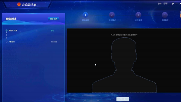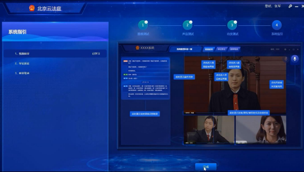 第三步 當(dāng)事人登錄北京云法庭客戶(hù)端時(shí)需要進(jìn)行檢測(cè),檢測(cè)電腦設(shè)備是否滿(mǎn)足庭審要求當(dāng)事人登錄后,進(jìn)入到庭審檢測(cè)頁(yè)面,分別對(duì)圖像、聲音、功放,進(jìn)行檢測(cè),檢測(cè)成功后,給與系統(tǒng)引導(dǎo)圖,便于當(dāng)事人了解系統(tǒng)如何使用。