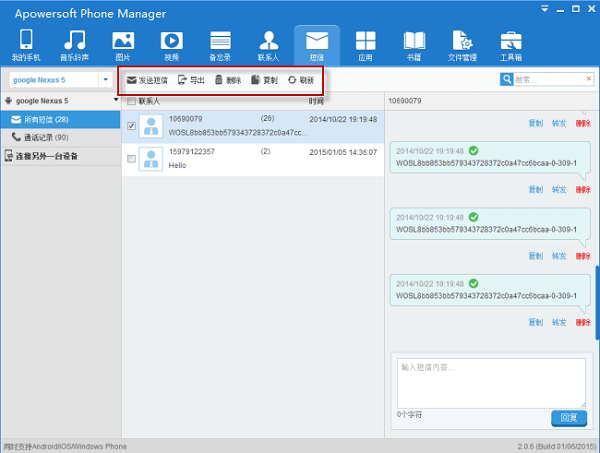 短信:短信界面可以將您的短信備份進電腦,也允許用戶在該界面將短信進行復制、轉(zhuǎn)發(fā)及刪除。同時它能一鍵選中并刪除所有的短信內(nèi)容,點擊刷新按鍵后所有更改的內(nèi)容便即時同步到手機里了。更為方便的是將聯(lián)系人添加到通訊錄,填寫好收信人的號碼及內(nèi)容就可以開始與其快速收發(fā)短信了。