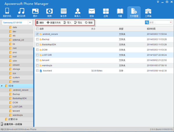 文件管理:根據(jù)文件系統(tǒng),文件管理功能將手機里面的文件歸為3大類:手機內(nèi)存、SD卡、擴展SD卡。對于這三大路徑下的任何文件,您可對其進行導入、導出、刪除、查看、刷新操作。此功能也支持新建文件夾在這3大類的目錄下或者是通過搜索功能快速找到您想要的文件。