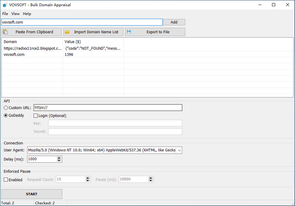 Bulk Domain Appraisal對(duì)大的域列表執(zhí)行多個(gè)域評(píng)估。填寫你的批量域名列表和評(píng)估你的所有域名。使用此工具,您可以輕松計(jì)算域名值。允許使用剪貼板或txt文件導(dǎo)入域名列表。結(jié)果可以導(dǎo)出為TXT或csv文件。默認(rèn)情況下,評(píng)估軟件使用的是gody工具。請(qǐng)注意,GoDaddy API每分鐘只允許60個(gè)請(qǐng)求。