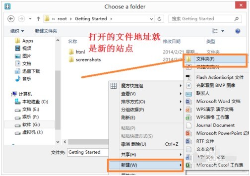左鍵點(diǎn)擊文件夾的名字,就可以打開(kāi)Open Folder,我們就可選擇或者新建一個(gè)文件夾作為網(wǎng)站站點(diǎn)。