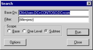 你還可以使用LDP進(jìn)行搜索, 這個(gè)工具包含在Microsoft Windows Server™ 2003 和 Windows® 2000 Server support tools中. 這個(gè)工具給予你不僅僅是搜索domain container的能力, 還有搜索Configuration container的能力. 你首先會(huì)打開(kāi)LDP, 然后連接到合法的domain controller上. 然后你需要使用合適的credential來(lái)綁定. 選擇View, 然后選擇Tree. 保持Base DN欄為空, 點(diǎn)擊OK.導(dǎo)航到你想要搜索的container上, 右擊container, 然后選擇Search.