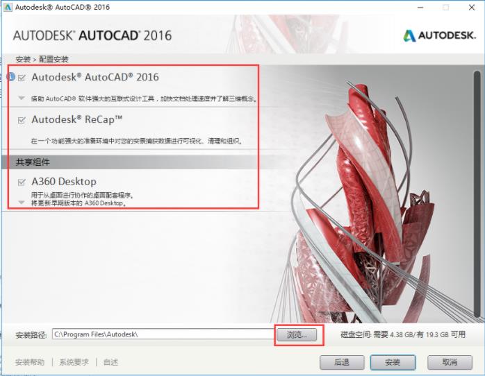 5、進(jìn)入AutoCAD2016配置安裝界面中,您需要根據(jù)自己的需求確定您是否安裝“AutoCAD2016”,“ReCap”和“A360 Desktop”選擇完成后,點(diǎn)擊【瀏覽】選擇AutoCAD2016破解版的安裝位置,然后點(diǎn)擊【安裝】。