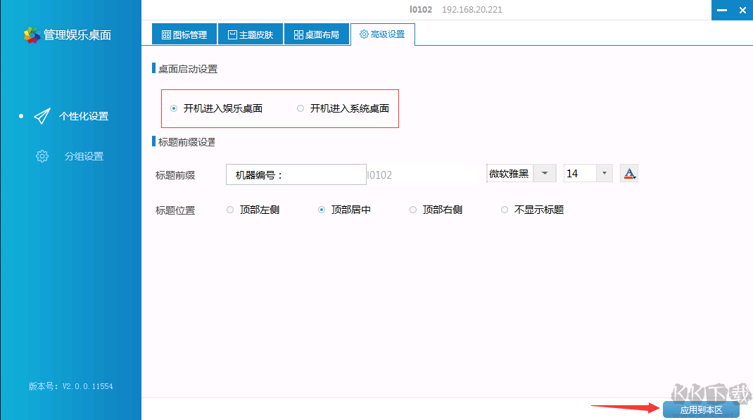 在桌面啟動設(shè)置中設(shè)置開機(jī)進(jìn)入娛樂桌面或者開機(jī)進(jìn)入系統(tǒng)桌面。最后點(diǎn)擊應(yīng)用到本區(qū)就可以了。
