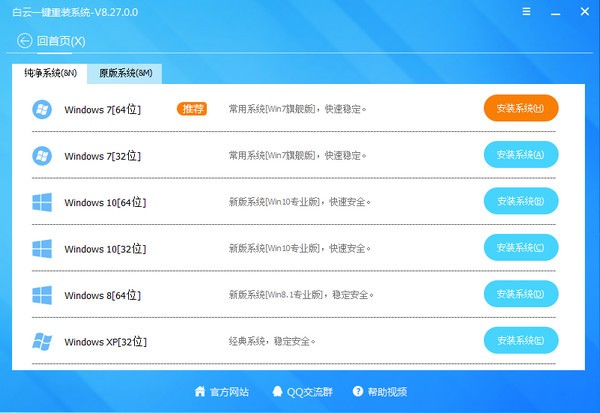 kkx小編給大家分享的【白云一鍵重裝系統(tǒng)】是針對(duì)需要系統(tǒng)重裝的用戶使用的一款傻瓜式一鍵電腦重裝系統(tǒng)軟件,操作簡(jiǎn)單,復(fù)雜的操作步驟,無(wú)需電腦基礎(chǔ)即可在線快速重裝系統(tǒng),支持xp win7 win8 win10操作系統(tǒng)自由選額,重裝只格式化C盤(pán),安裝前重備份桌面和C盤(pán)重要數(shù)據(jù),其他磁盤(pán)數(shù)據(jù)不影響,是目前重裝系統(tǒng)比較常用的一種重裝方式,當(dāng)然需要你的電腦還能掙開(kāi)機(jī)以及正常上網(wǎng)!