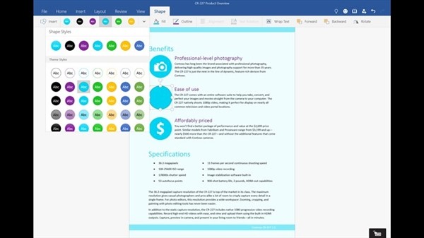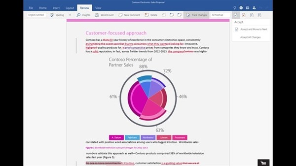 這款針對觸屏優(yōu)化的應(yīng)用允許用戶創(chuàng)建、編輯、評論和標(biāo)記文檔。你可以與他人分享你的任務(wù),實時協(xié)作對文檔進行修改。閱讀模式中新加入的Insights for Office功能(由Bing提供數(shù)據(jù),首次出現(xiàn)在Office Online上)可以為用戶提供包括圖片、網(wǎng)頁內(nèi)容在內(nèi)的額外在線資源,重新定義用戶的閱讀體驗。