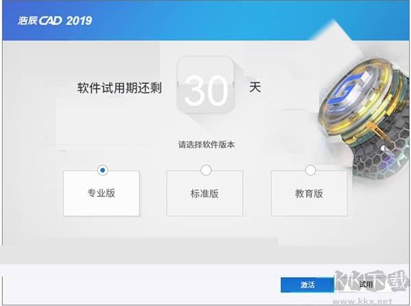 1、打開桌面上生成的浩辰cad2019圖標(biāo),試用期30天,可以選用專業(yè)版,標(biāo)準(zhǔn)版和教育版;