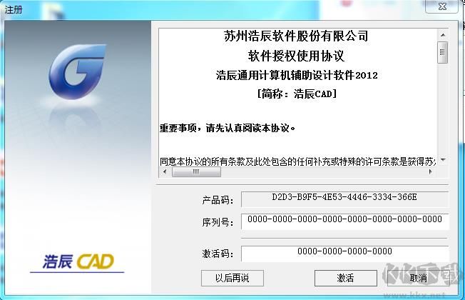 4、打開浩辰CAD2012,這時(shí)軟件還會(huì)出現(xiàn)激活窗口,不用管它,點(diǎn)以后再說;