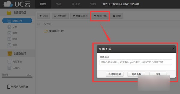 離線下載是服務器取代客戶到目的網站下載文件,并存放到UC網盤的一種下載工具。