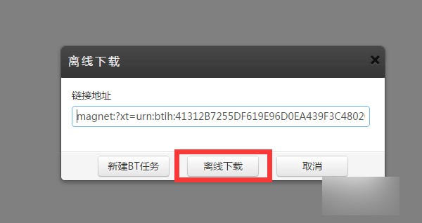 5、然后返回“離線下載”界面,粘貼對應的磁 力鏈接地址,點擊“離線下載”按鈕即可下載對應的磁 力資源?;蛘唿c擊“新建BT任務”按鈕通過BT種子下載對應的資源文件。