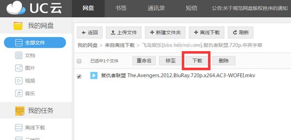 9、目前UC網盤功能比較單一,無法實現在線觀看視頻文件的功能,不過提供了“下載”功能,如圖所示。