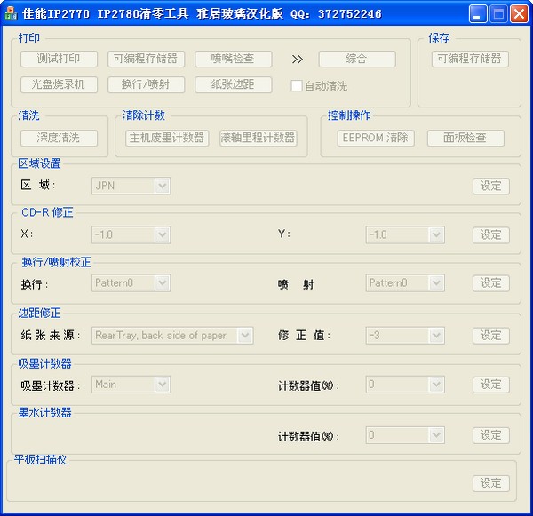 佳能IP2770/2780清零工具是一款支持佳能ip2780以及ip2770打印機(jī)的清零工具,是一款非常不錯(cuò)的打印機(jī)維護(hù)工具,支持測(cè)試打印、可編程存儲(chǔ)器、噴嘴檢查、光盤燒錄機(jī)、換行/噴射、紙張邊距,深度清洗,主機(jī)廢墨計(jì)數(shù)器,滾軸里程計(jì)數(shù)器,EEPROM清除,面板檢查,區(qū)域設(shè)置等功能!