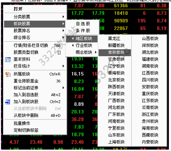 2. 點擊右鍵彈出菜單,也可選擇不同的股票市場及板塊。自選股、板塊股、條件選股是系統(tǒng)內(nèi)置的,分