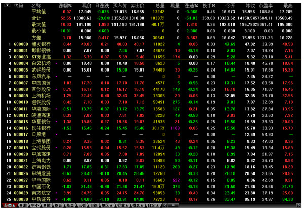 敲數(shù)字81、82、83、84、85、86、87,可分別調(diào)出上海A、B股,深圳A、B股,滬債、深債,深滬A股的綜合排名。系統(tǒng)用9個排成方陣的小窗列出所選市場的股票的漲幅、跌幅、振幅、5分鐘漲幅、5分鐘跌幅、量比、委比、成交金額排名。