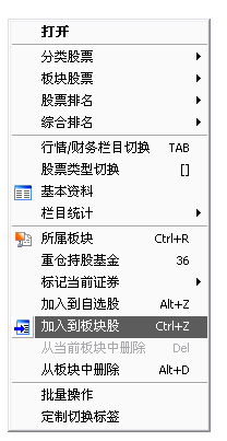 按前面介紹的方法找到需要的股票后,用鼠標右鍵點擊它,從彈出菜單上選擇〖加入到自選股〗或〖加入到板塊〗,或按Ctrl+Z。刪除自選股按ALT+D