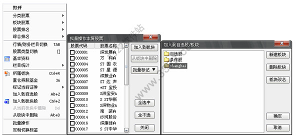 需要將某個板塊或者行業(yè)加入到自選股中,可以使用批量操作: 1 、在行情報價界面,點擊鼠標右鍵,選擇批量操作。 2 、勾選自己需要添加到板塊中的股票,或者選擇“全選中”。 3 、選擇好股票后點擊“加入到板塊”。 4 、點擊要加入的板塊,也可以新建一個板塊,按確定添加成功。