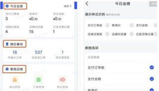2、在“首頁頁面”上可以查看“今日業(yè)績”、“待辦事項(xiàng)”、“常用應(yīng)用”三個(gè)板塊。其中,“今日業(yè)績”具體涵蓋支付數(shù)據(jù)、售后數(shù)據(jù)、店鋪數(shù)據(jù)、財(cái)務(wù)數(shù)據(jù),又可細(xì)分為“支付訂單數(shù)”、“支付金額”、“店鋪訪客數(shù)”、“已發(fā)貨售后量”等細(xì)分的數(shù)據(jù)指標(biāo),商家還可以根據(jù)個(gè)人需求對(duì)顯示的數(shù)據(jù)字段進(jìn)行調(diào)整。