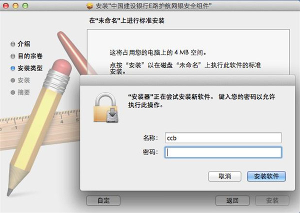 5、輸入MAC OS操作系統(tǒng)密碼后,點(diǎn)擊“安裝軟件”,如圖:
